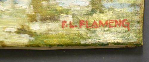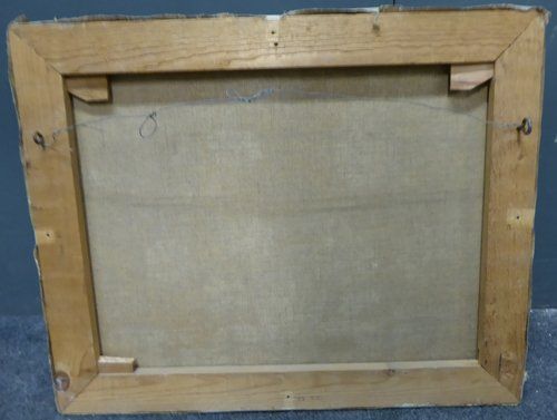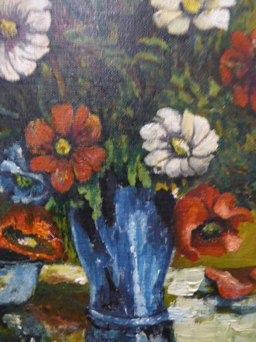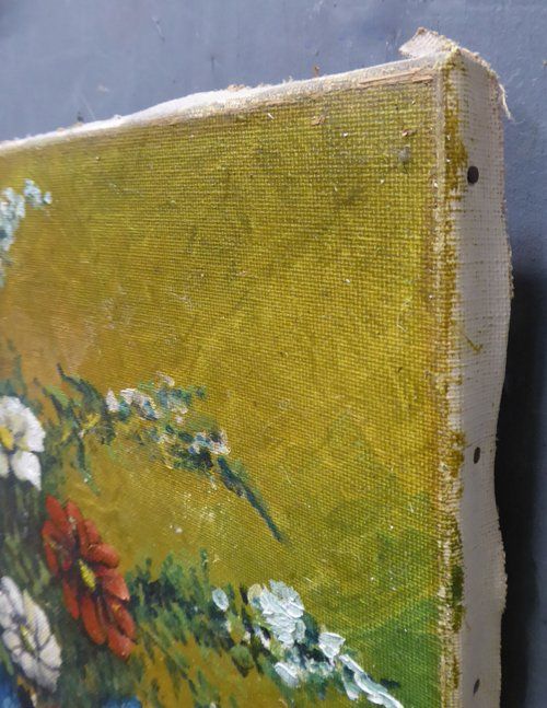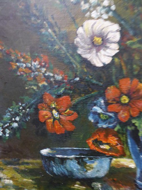 Ref 7772 - Oil on canvas still life of vase of flowers on original wooden stretcher. Signed. Circa 1950.