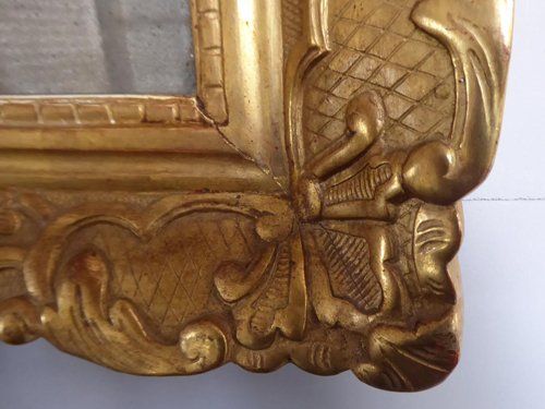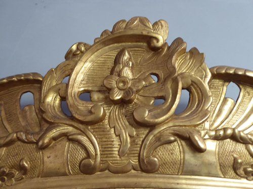 Ref 7784 - Antique French Mirror - Period Louis XV carved giltwood crested antique mirror. Good original two tone gilt. Original patinated mercury glass. Original pine board back. Circa 1750