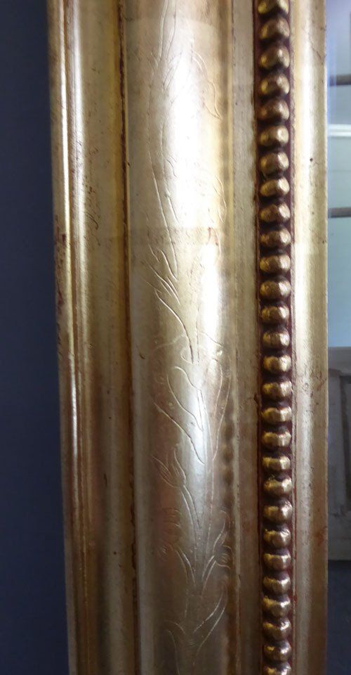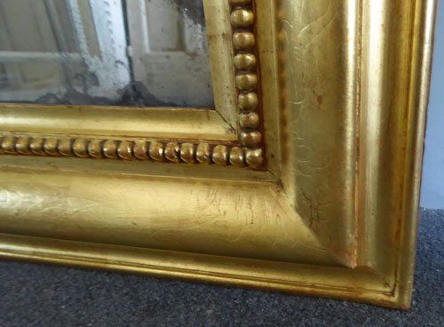 Ref 7787 - Antique French Mirror - Large gilt on red period Louis Philippe antique mirror with etched decoration to frame. Original mercury glass with some heavily patinated areas to bottom third. Original panelled back. Circa 1840.