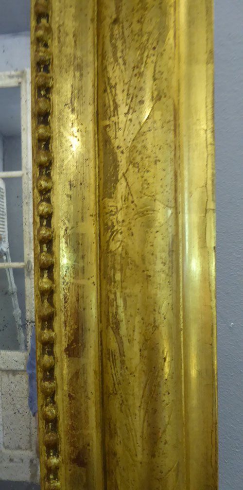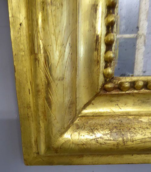 Ref 7805 - Antique French Mirror - Gilt on red period Louis Philippe antique mirror with flower and leaf etching to frame. Original patinated mercury glass. Original pine board back. Circa 1840.