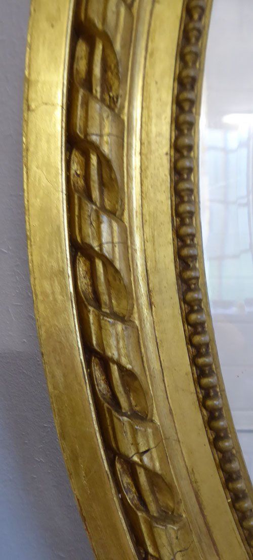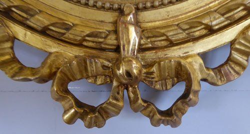 Ref 7806 - Antique French Mirror - Gilt on red Louis XVI ribbon crested oval mirror. Original bevelled glass. Original thin card back. Circa 1890.