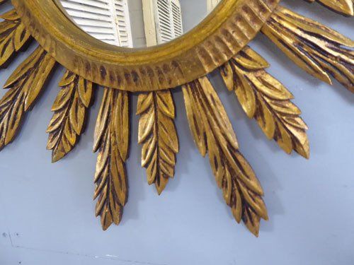 Ref 7823 - Large carved giltwood sunburst mirror. Original glass. Circa 1950.