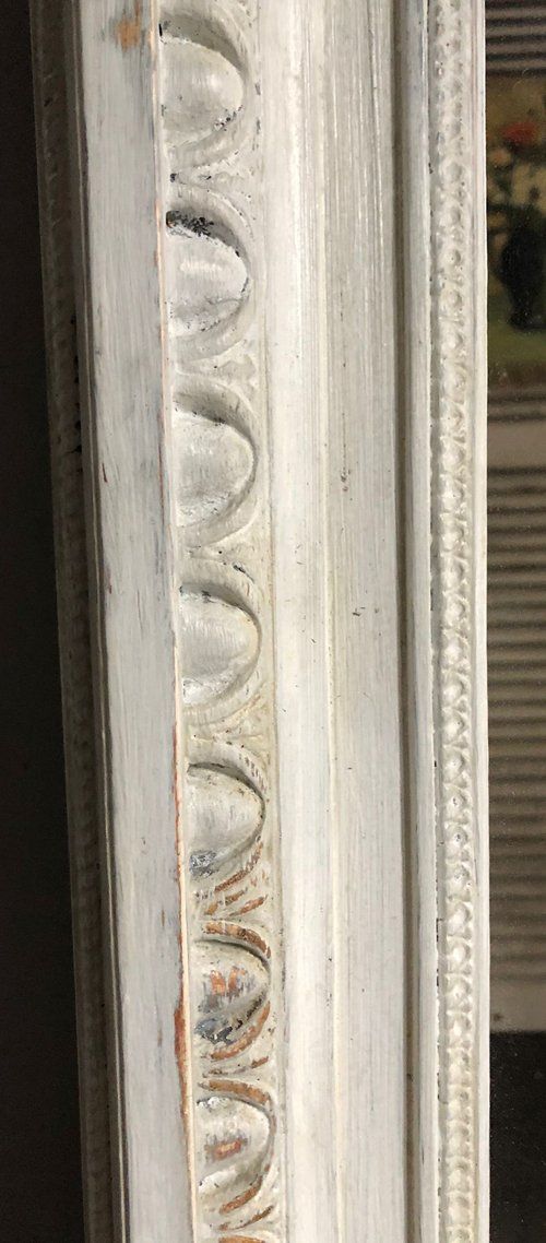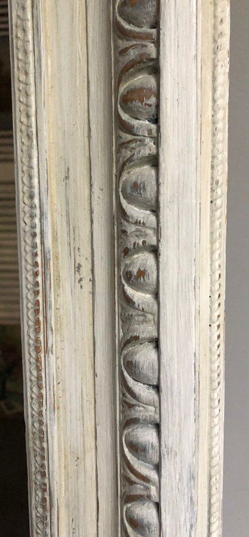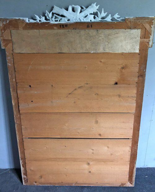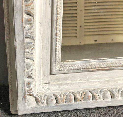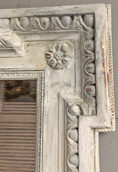 Ref 7824 - Antique French Mirror - Worn pale grey painted Louis XVI crested antique mirror . Original glass. Original pine board back with one replaced piece. Circa 1880.