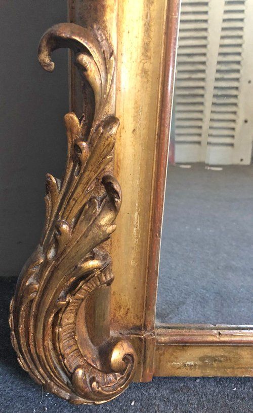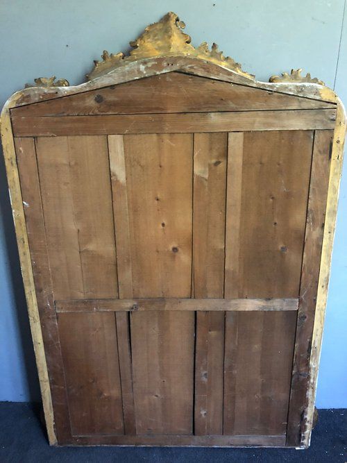 Ref 7833 - Antique French Mirror - Large gilt on red Louis XV style camel crested antique mirror with gesso decoration to frame. Finished in original mellow two tone gilt worn through to red bole and white gesso in places. Original bevelled glass. Original panelled back. Circa 1860.