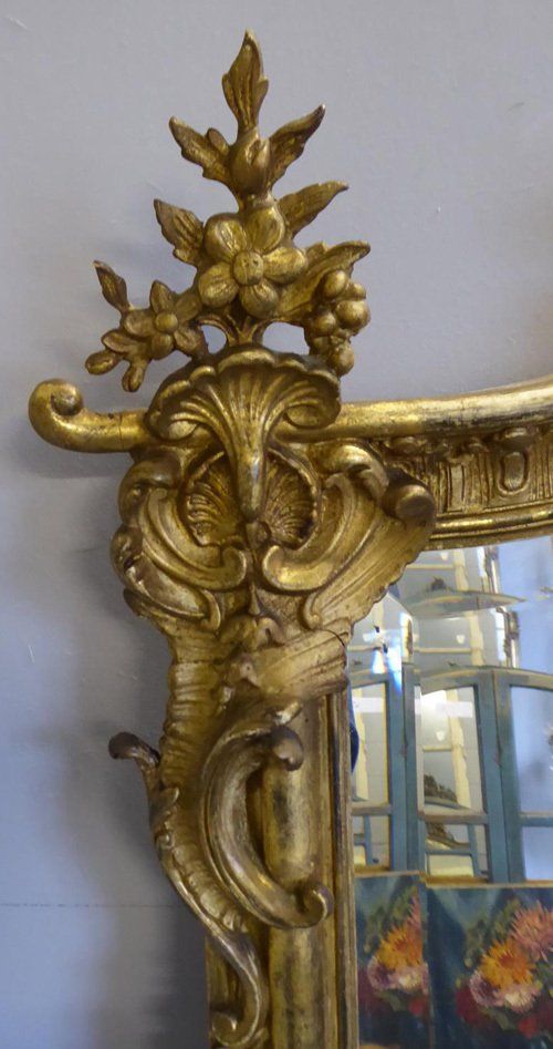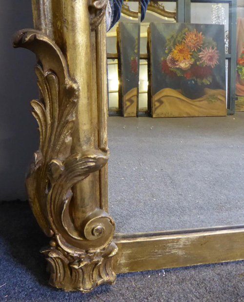 Ref 7837 - Antique French Mirror - Large gilt on black camel crested Louis XV style antique mirror with gesso decoration to frame. Finished in original dark patinated two tone gilt worn through to black bole in places. Original bevelled glass. New plywood back. Circa 1890.