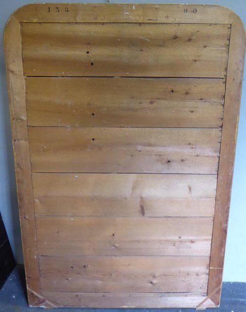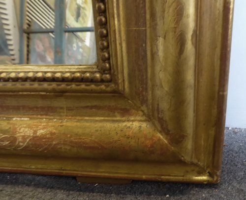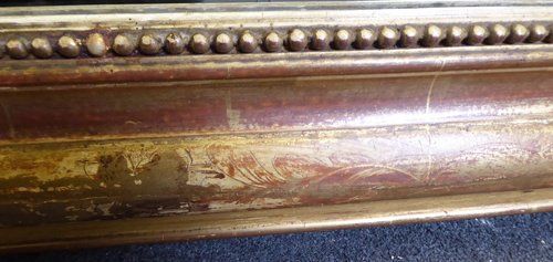 Ref 7839 - Antique French Mirror - Large gilt on red Louis Philippe antique mirror with flower and leaf etching to frame. Finished in original two tone gilt worn through to red bole and white gesso in places. Original glass. Original pine board back. Circa 1880.