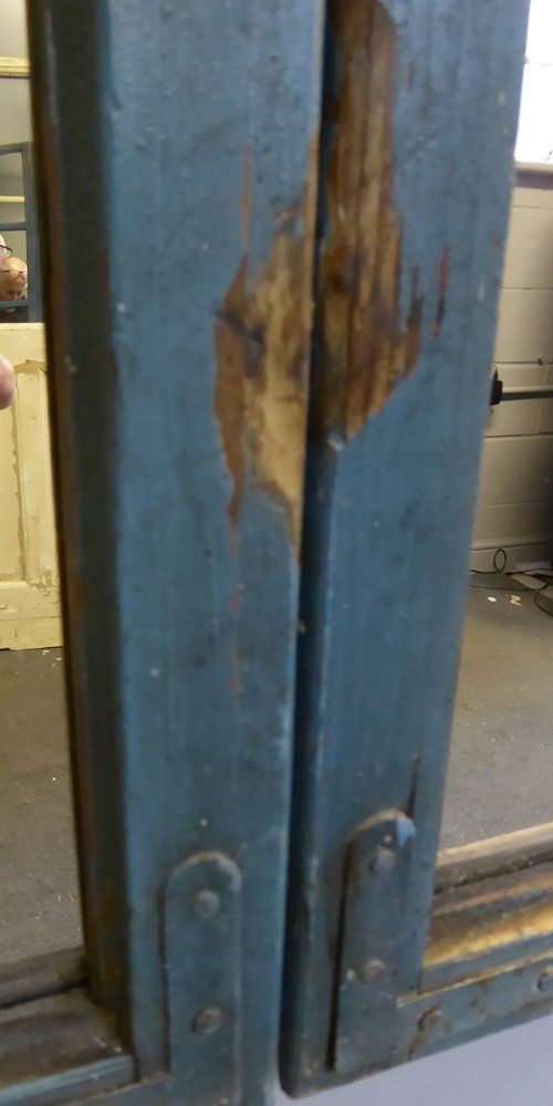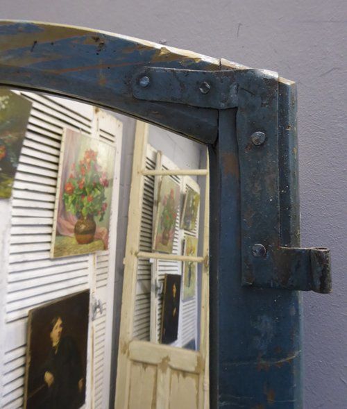 Ref 7858 - Pair of worn blue painted antique French arch top window frames. Glazed with new mirror glass. Circa 1900.