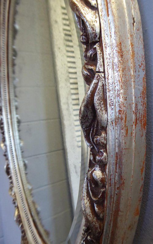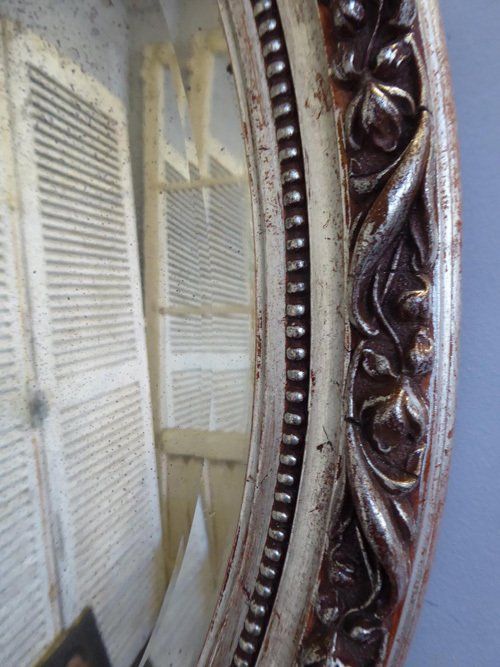 Ref 7885 - Antique French Mirror - Silver on red oval antique mirror with gesso decoration to frame. Finished in silver worn through to red bole in places. Original patinated bevelled glass. Old thin veneer back. Circa 1900.