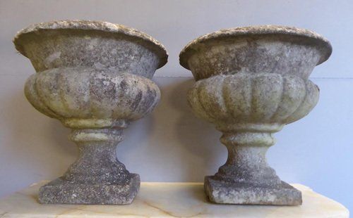Ref 7890 - Pair of attractively weathered and patinated vintage composite urns. Circa 1950.