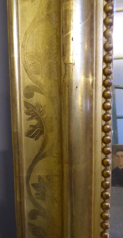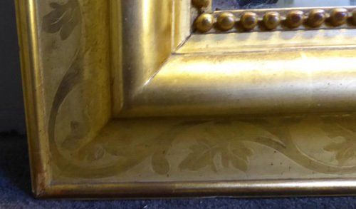 Ref 7893 - Antique French Mirror - Gilt on red crested Louis Philippe antique mirror with vine leaf etching to outer frame. Finished in original two tone gilt on red. Original glass. Original pine board back. Circa 1880.