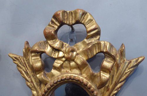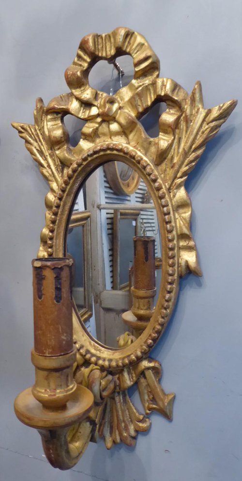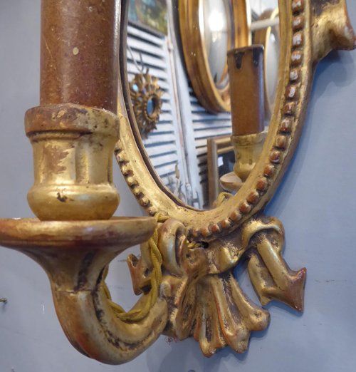 Ref 7909 - Pair of carved giltwood single light wall lights with double crested oval mirror backs. New electric bulb holders and working wiring. Circa 1950.