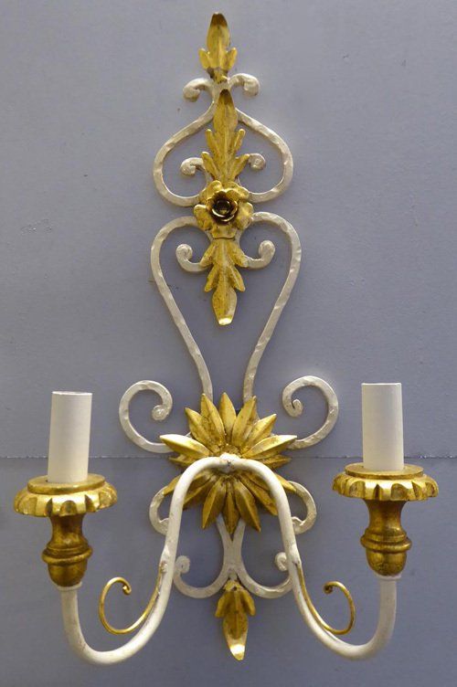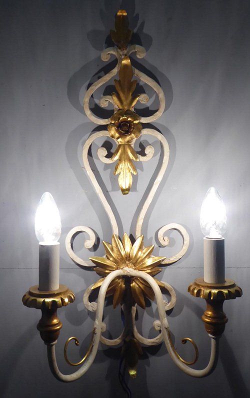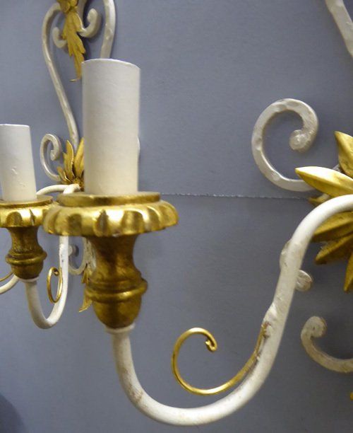 Ref 7912 - Pair of large vintage cream and gilt painted wood and wrought iron two wall lights. Working bulb fittings and wiring. Circa 1960.