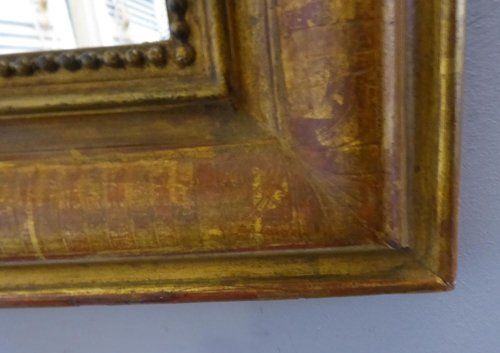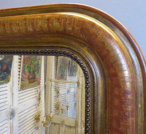 Ref 7914 - Antique French Mirror - Gilt on red Louis Philippe antique mirror with line etching to frame. Finished in original mellow two tone gilt worn through to red bole. Original patinated glass with some faint surface scratches and small black marks to back of plate. Original pine board back. Circa 1880.