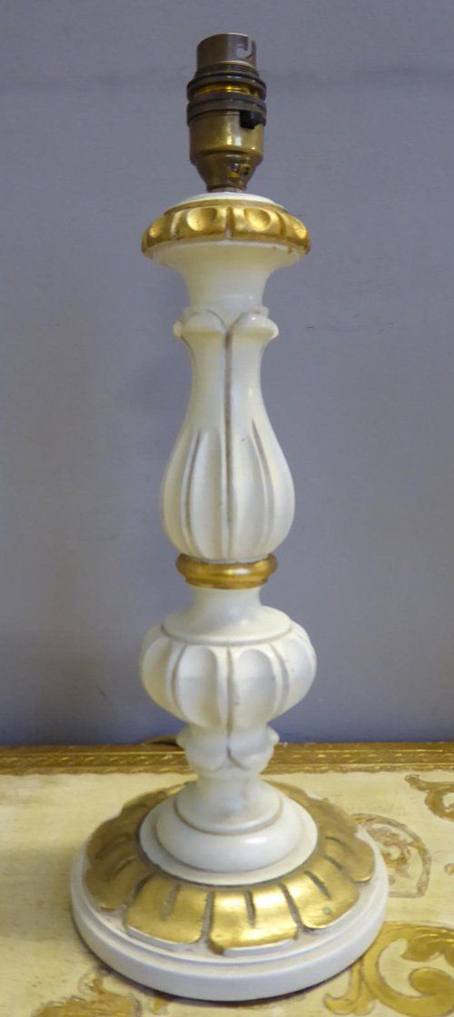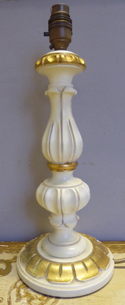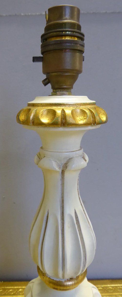 Ref 7916 - Pair of carved wood vintage lamp bases finished in original cream paint with gilt highlights. Switched brass bulb holder with shade ring. Later working gold coloured flex and fitted plugs. Circa 1960.