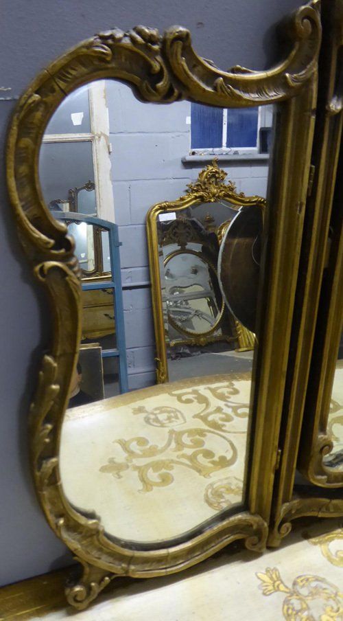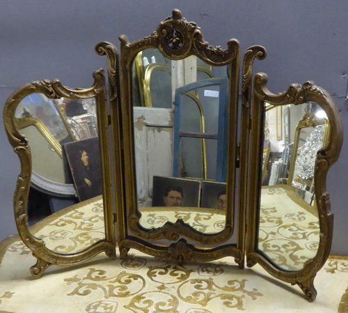 Ref 7917 - Antique French Mirror - Gilt Louis XV style tripleplate dressing table mirror with gesso decoration and crest to central mirror frame. Original dark patinated gilt finish with some non structural shrinkage cracks to the gesso decoration. Original lightly patinated glass. Original back. Circa 1900.