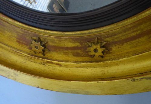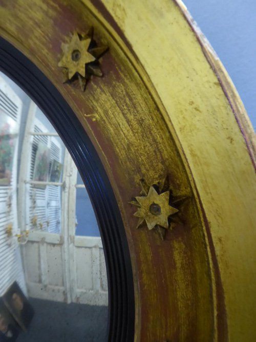 Ref 7922 - Antique French Mirror - Large carved giltwood antique convex mirror. Carved giltwood double star decoration to frame with some missing rays. Original lightly patinated mercury convex glass. Original mahogany insert to inner frame. Original back. Circa 1820.