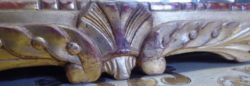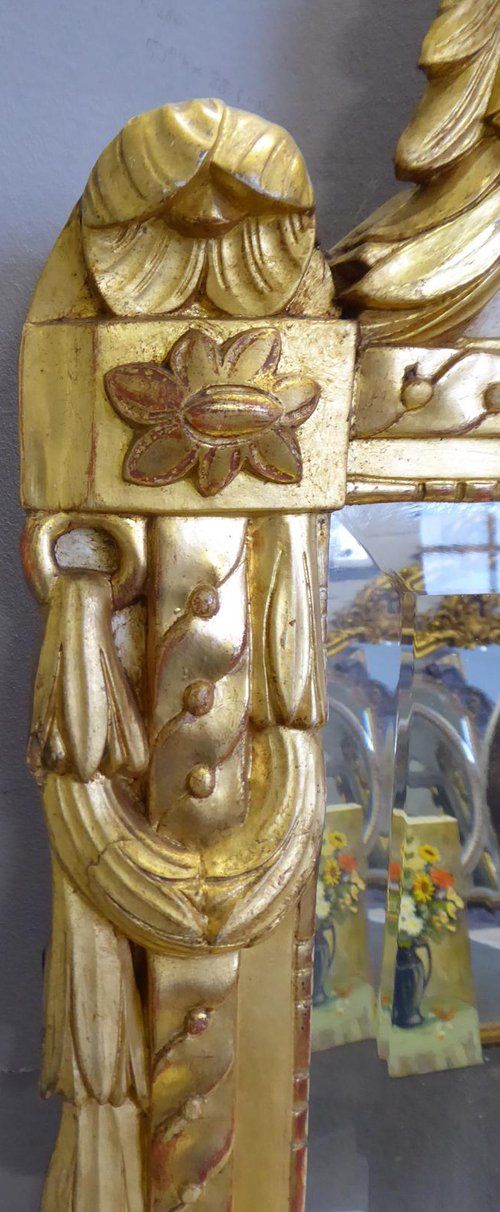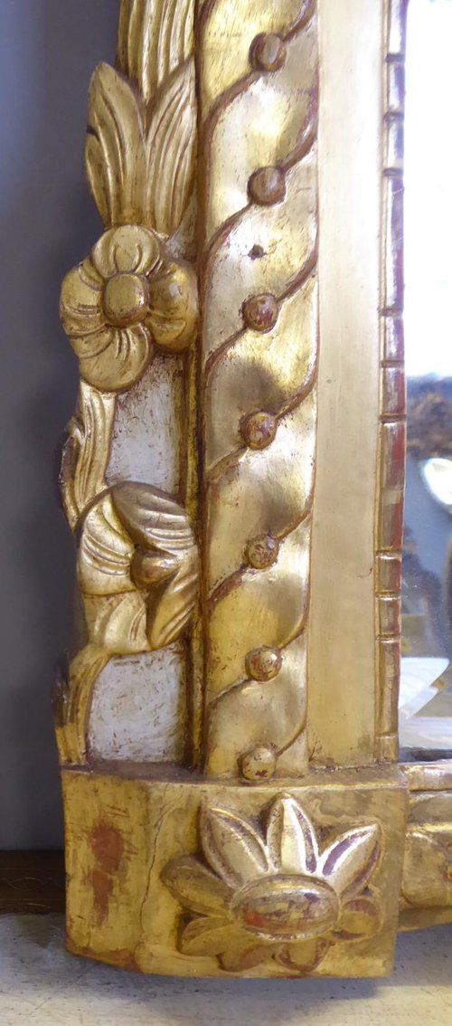 Ref 7923 - Antique French Mirror - Carved giltwood urn crested antique mirror. Finished in gilt on red with cream painted section to crest. Original bevelled glass. Original pine board back. Some old inactive and treated woodworm holes to back. Circa 1890.