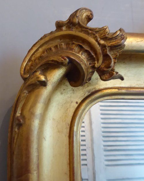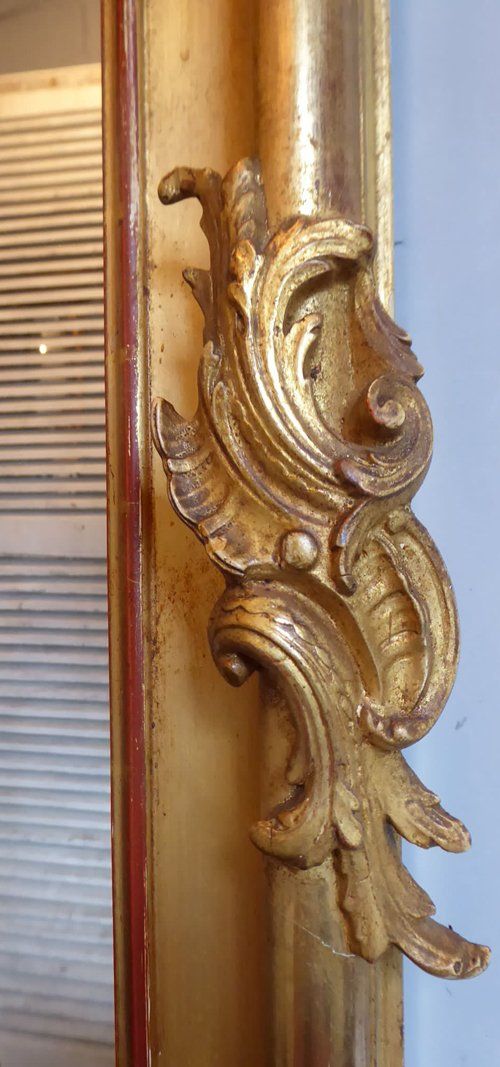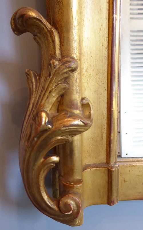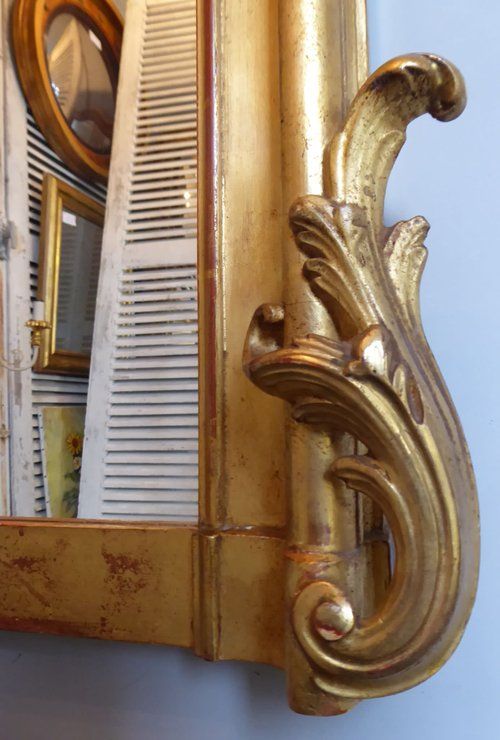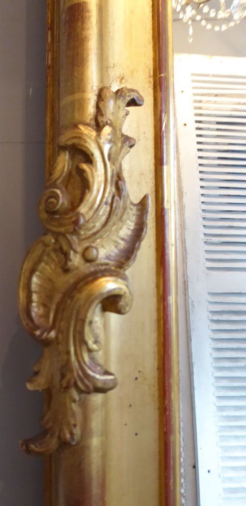Ref 7927 - Antique French Mirror - Gilt on red camel crested Louis XV style antique mirror with gesso decoration to frame. Finished in original two tone gilt worn through to red bole in places. New glass. Original thin veneer back. Circa 1900.