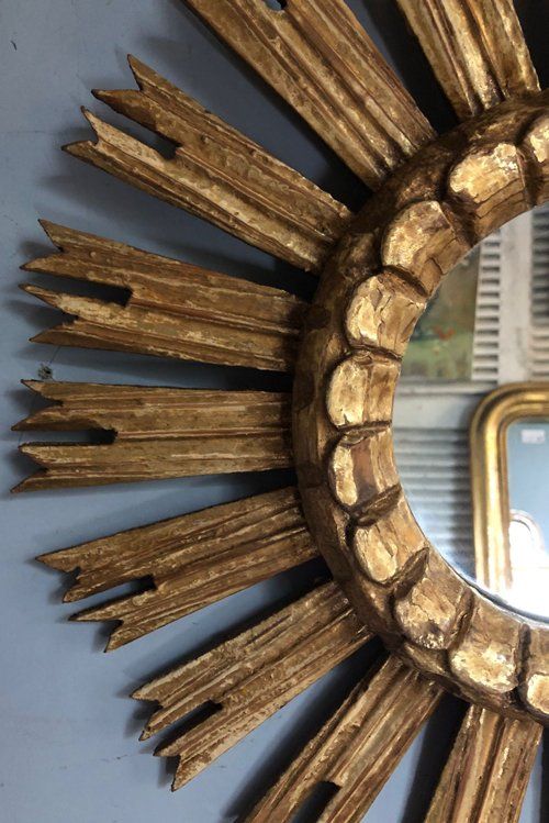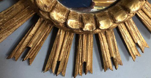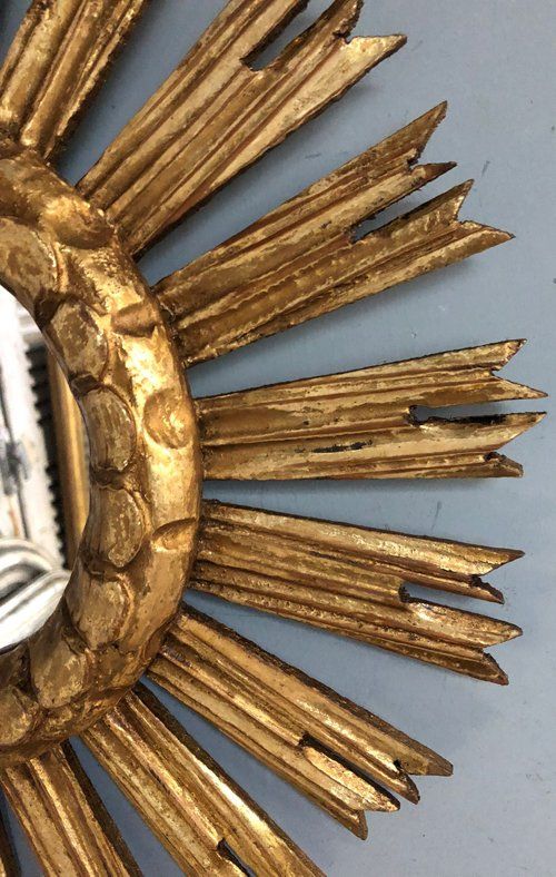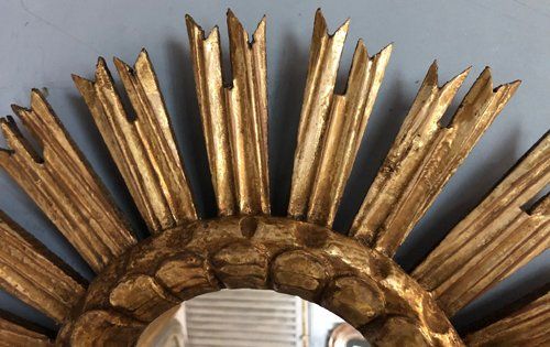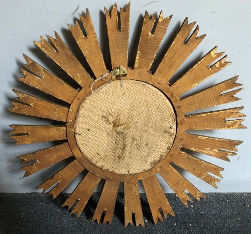 Ref 7931 - Worn carved giltwood sunburst mirror worn through to white gesso in places. Original glass. Circa 1950.