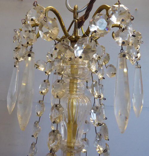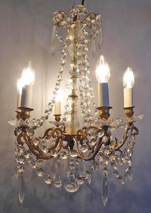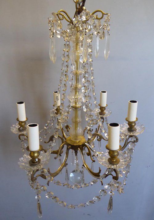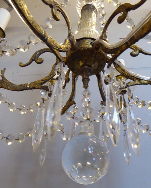 Ref 7937 - 19th Century 6 arm brass Napoleon III antique French chandelier with original clear crystals. Newly wired. Circa 1860.