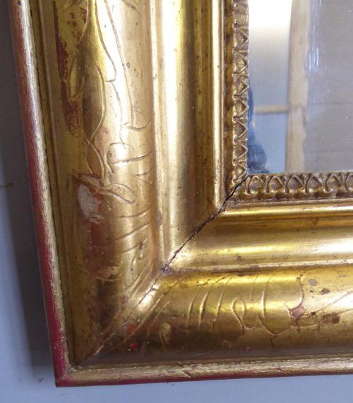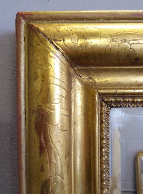 Ref 7939 - Antique French Mirror - Period gilt on red Louis Philippe antique mirror with flower and leaf etching to frame. Landscape/portrait. Original mercury glass. Original pine board back. Circa 1840.