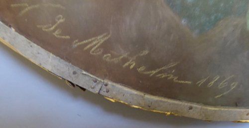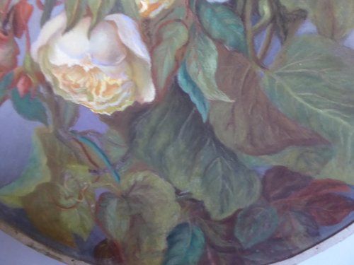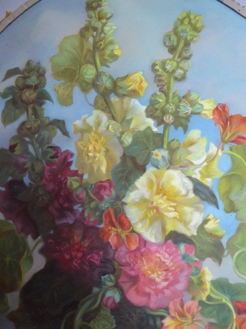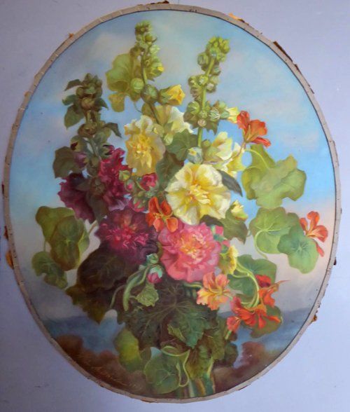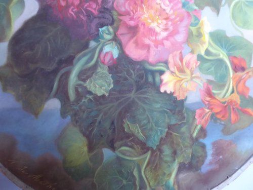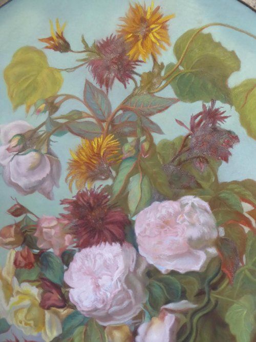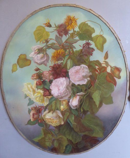 Ref 7943 - Pair of oval antique French still life floral paintings in pastel on canvas. Original wooden stretcher with no damage or tears to canvas. Signed and dated 1869.