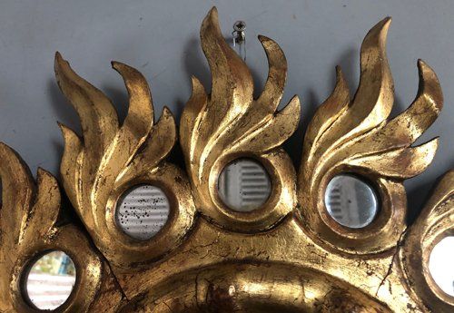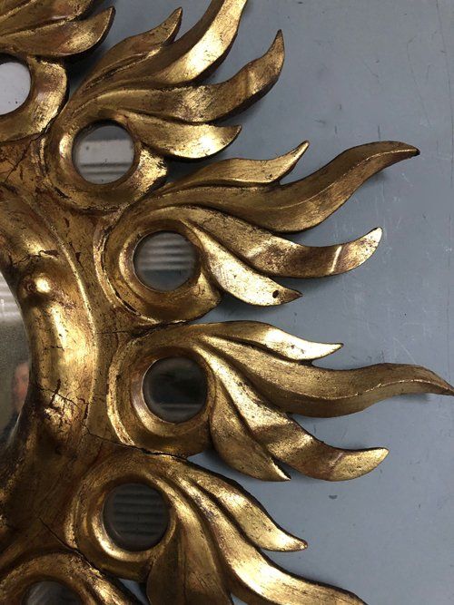 Ref 7956 - Carved giltwood sunburst mirror with circular inset mirrors to frame. Original patinated glass. Circa 1950.