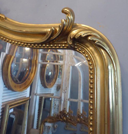 Ref 7959 - Antique French Mirror - Gilt camel crested Louis XV style antique mirror. Finished in original two tone gilt on red. Original bevelled glass with one small surface scratch to back of plate. Original thin veneer back. Circa 1900.