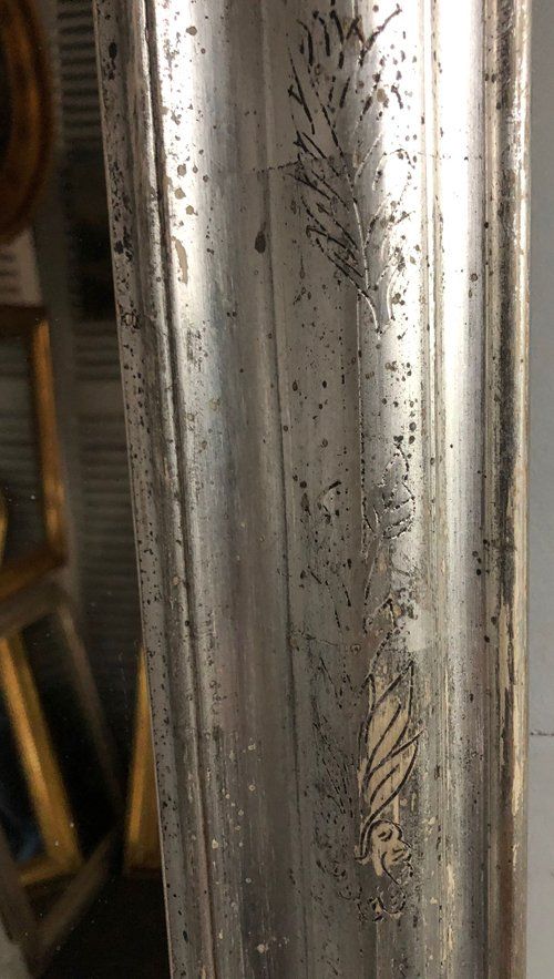 Ref 7964 - Antique French Mirror - Silver on black Louis Philippe antique mirror with flower and leaf etching to frame. Worn through to black bole and white gesso in places. Original glass. Original pine board back. Circa 1880.