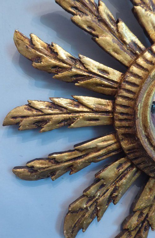 Ref 7978 - Carved giltwood sunburst mirror. Original convex glass. Circa 1950.