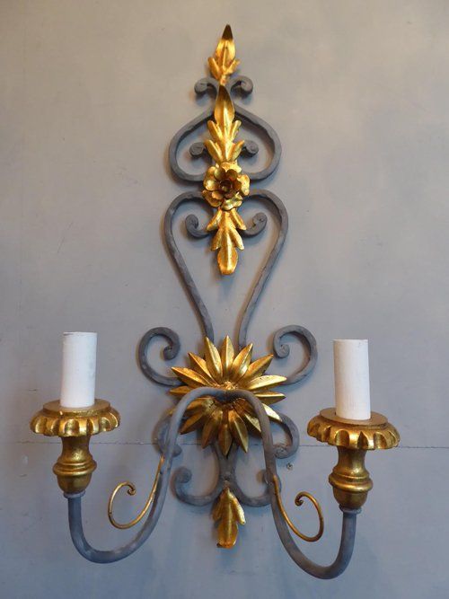 Ref 7989 - Pair of large vintage dark grey and gilt painted wood and wrought iron two wall lights. Working bulb fittings and wiring. Circa 1960.