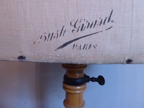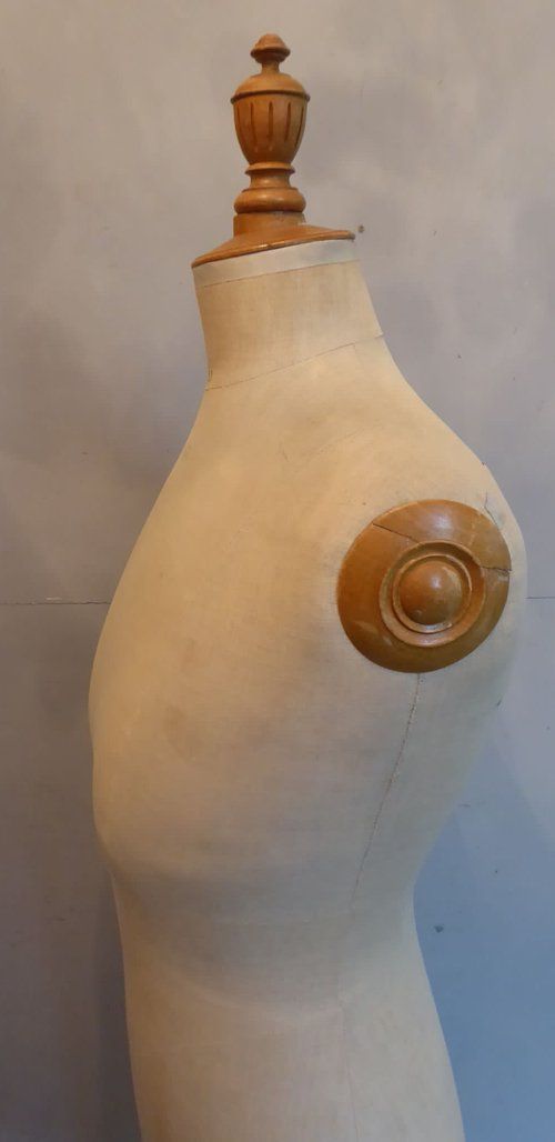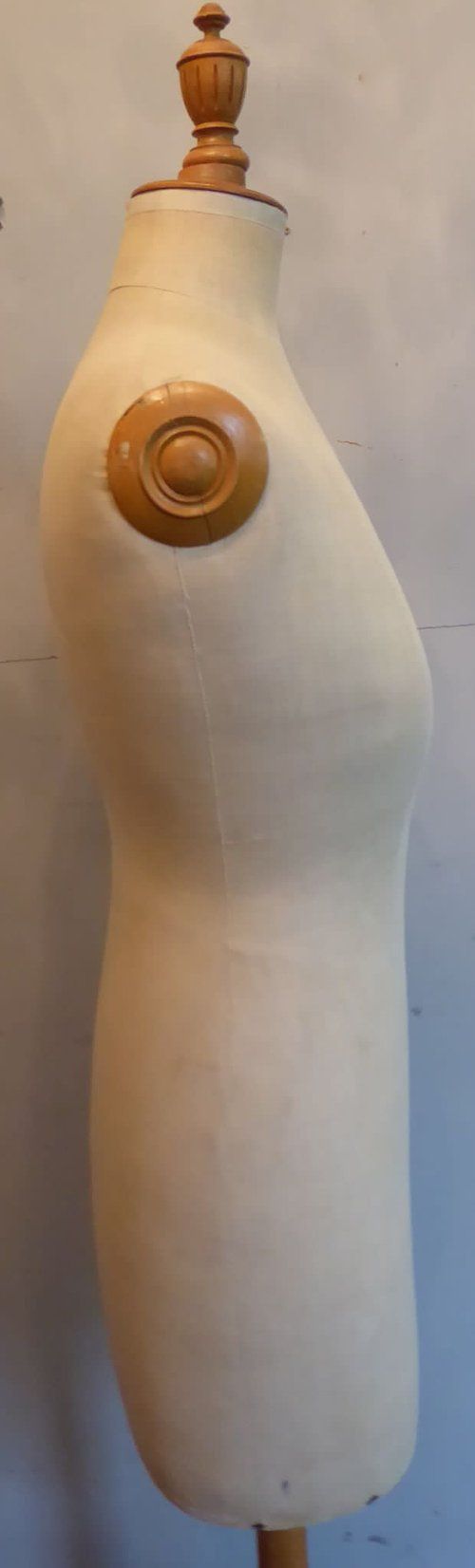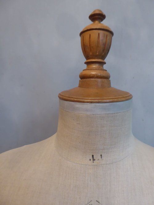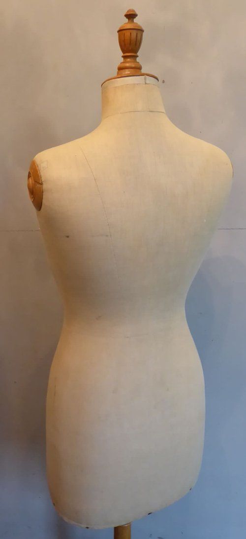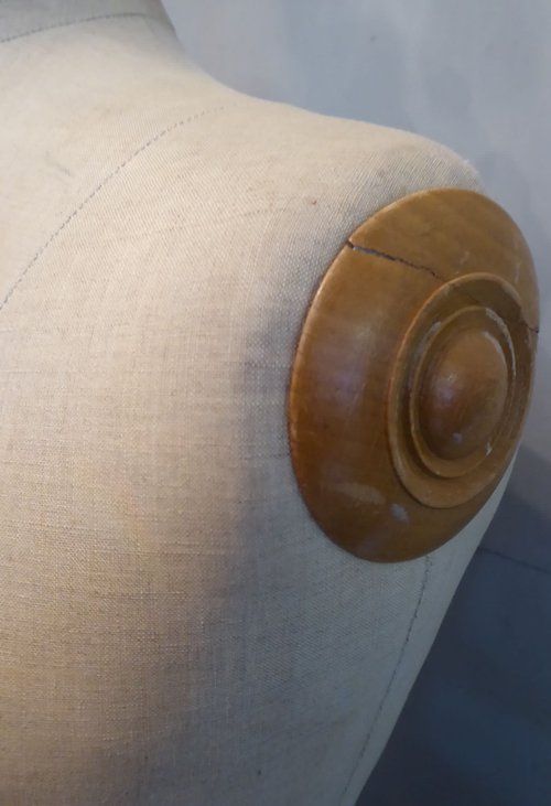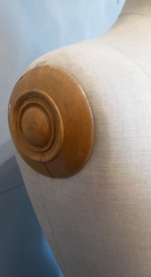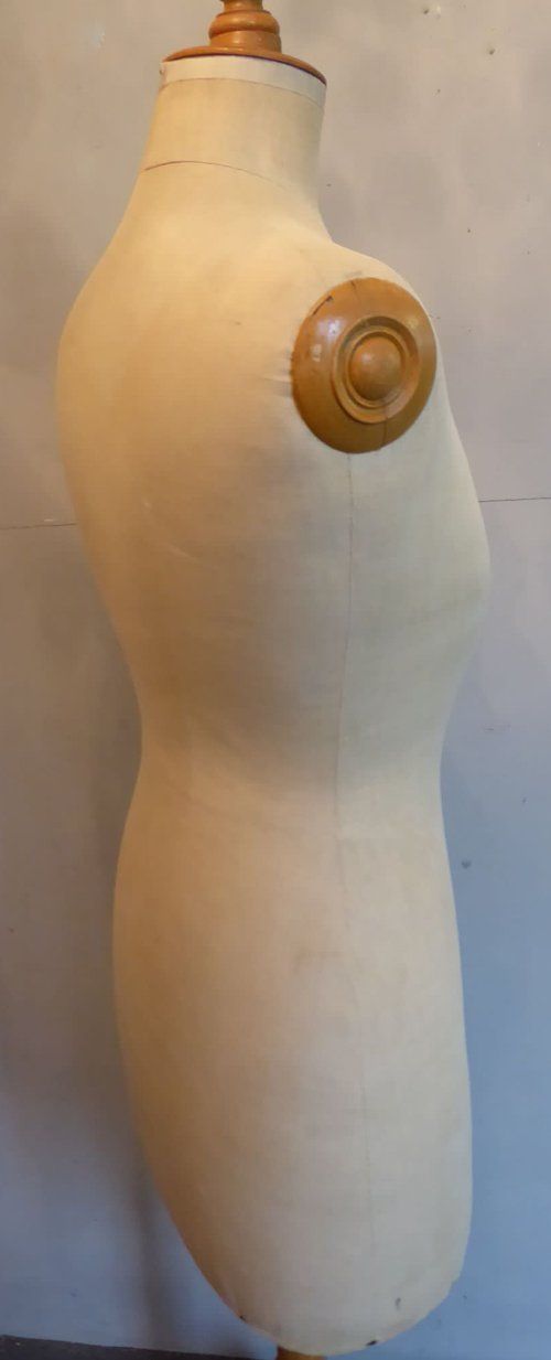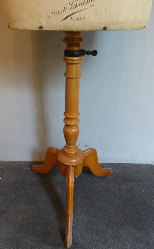 Ref 7994- Vintage French mannequin on original adjustable blond wood tripod stand. Original cloth covering. Stamped Girard Paris. Euro size 44. Circa 1930.
