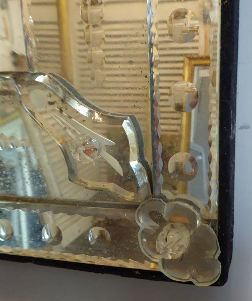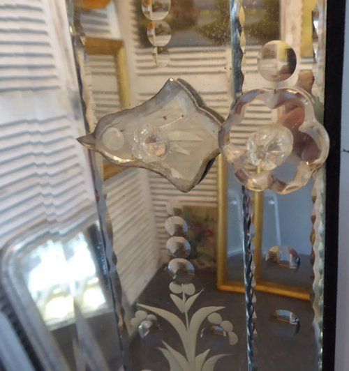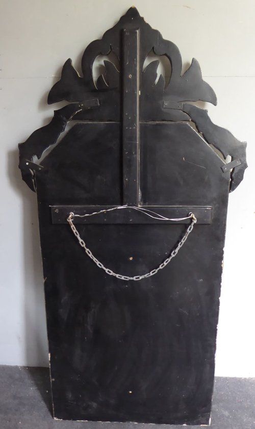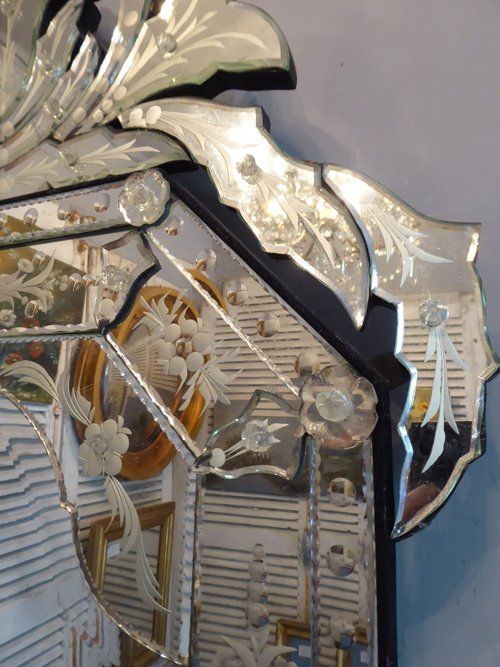 Ref 7999 - Venetian crested mirror with reverse etched decoration to glass. Original glass with bevelled centre plate. Some patination to outer glass margins. Very good original condition with no damaged or missing pieces. Original black painted wooden back. Circa 1950.
