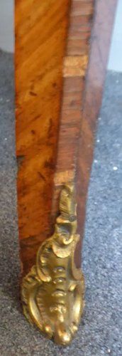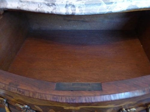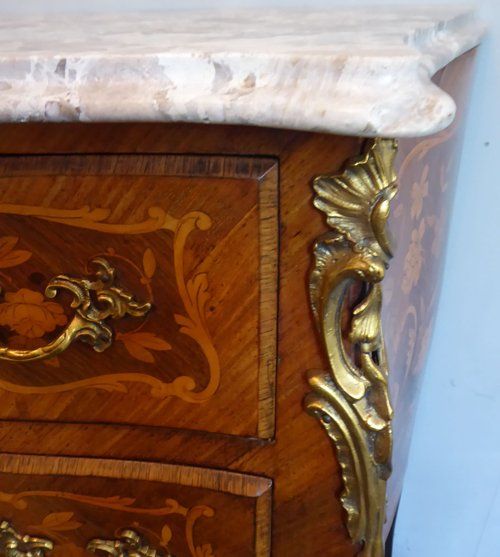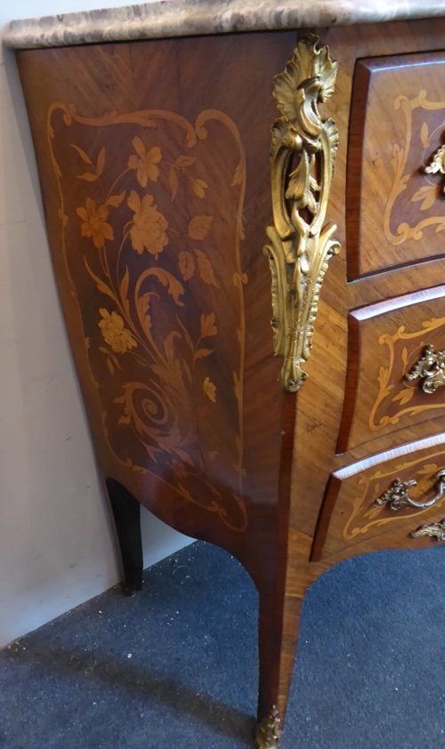 Ref 8000 - 19th Century French Louis XV marble topped inlaid commode with three drawers. Original ormolu fittings with working locks and key. Original marble top with some small chips to front corners. Some very small pieces of missing veneer. Circa 1880.