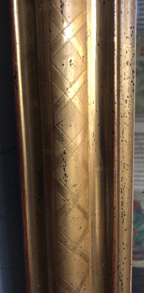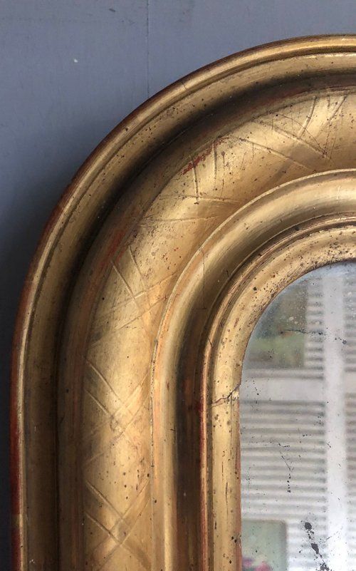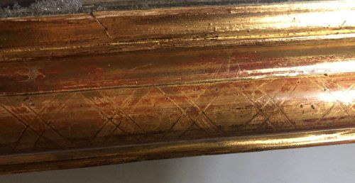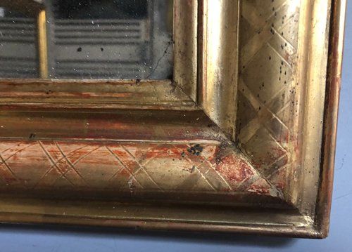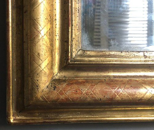 Ref 8007 - Antique French Mirror - Gilt on red period Louis Philippe antique mirror with cross hatch etching to frame. Two tone gilt worn through to red gesso and white bole in places. Original mercury glass with some small patinated areas. Original pine board back. Circa 1840.