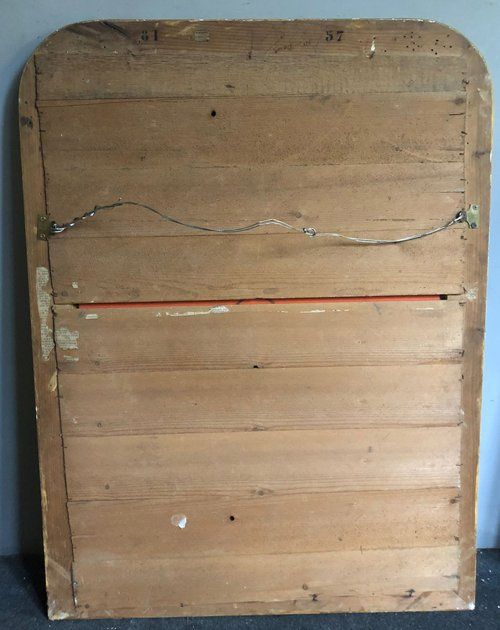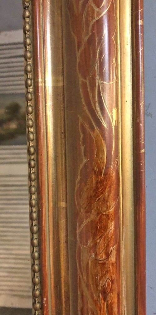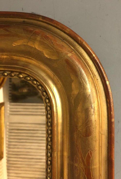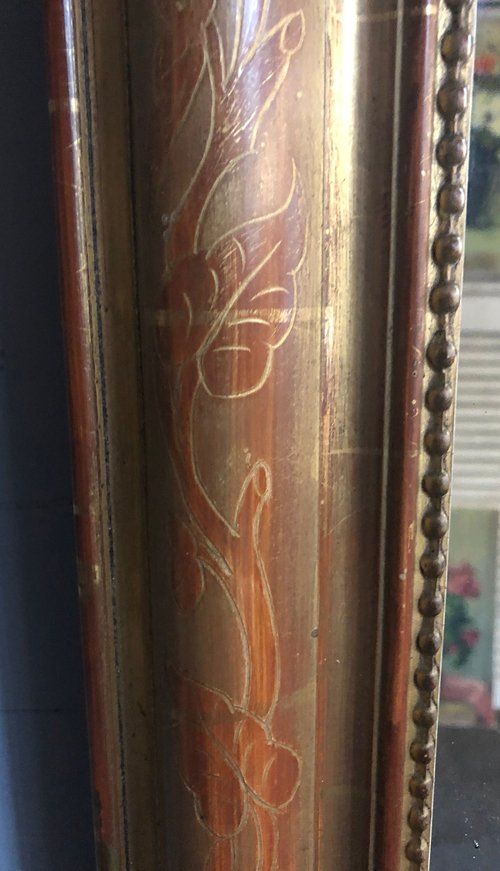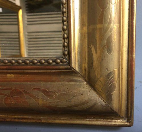Ref 8011 - Antique French Mirror - Gilt on red Louis Philippe antique mirror with vine leaf etching to frame. Finished in two tone gilt worn through to red bole in places. Original glass. Original pine board back. Circa 1880.
