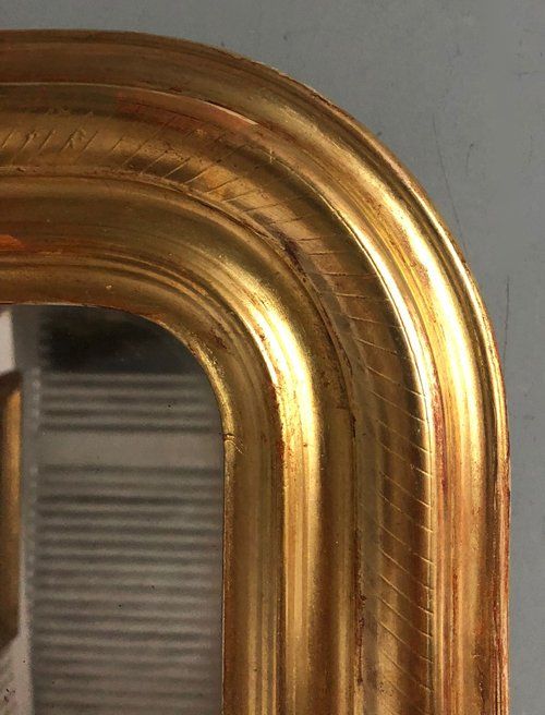 Ref 8029 - Antique French Mirror - Gilt on red Louis Philippe antique mirror with line etching to frame. Original glass. Original pine board back. Circa 1880.