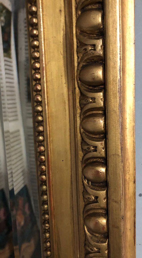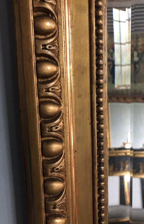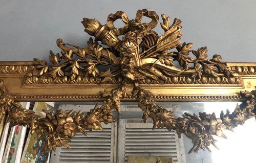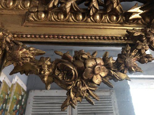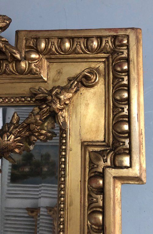 Ref 8043 - Antique French Mirror - Gilt Louis XVI crested mirror with flower swags and gesso decoration to frame. Finished in two tone gilt on red. Original bevelled glass with some small black spots to top half of plate. Original pine board back. Circa 1890.