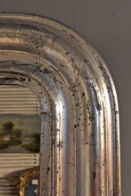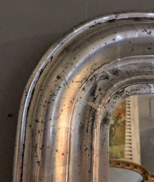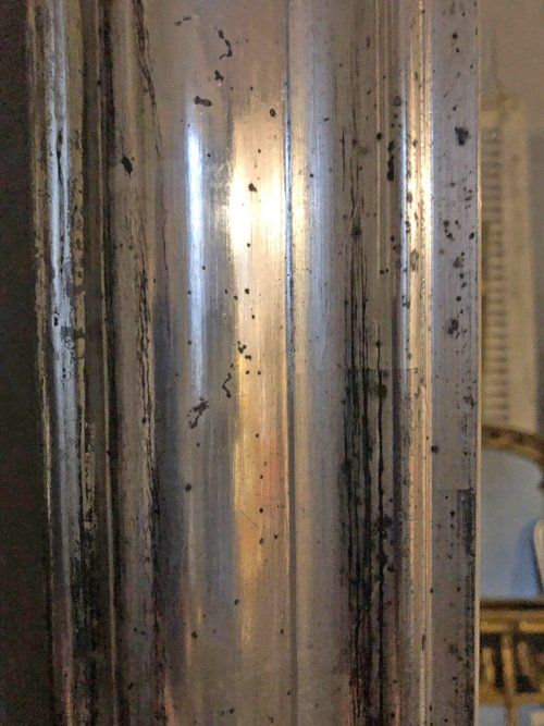 Ref 8046 - Antique French Mirror - Silver on black Louis Philippe antique mirror. Two tone silver worn through to black bole and white gesso in places. Original glass. Original pine board back. Circa 1880.