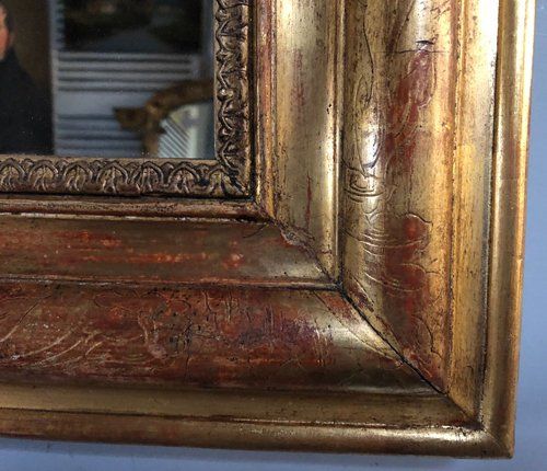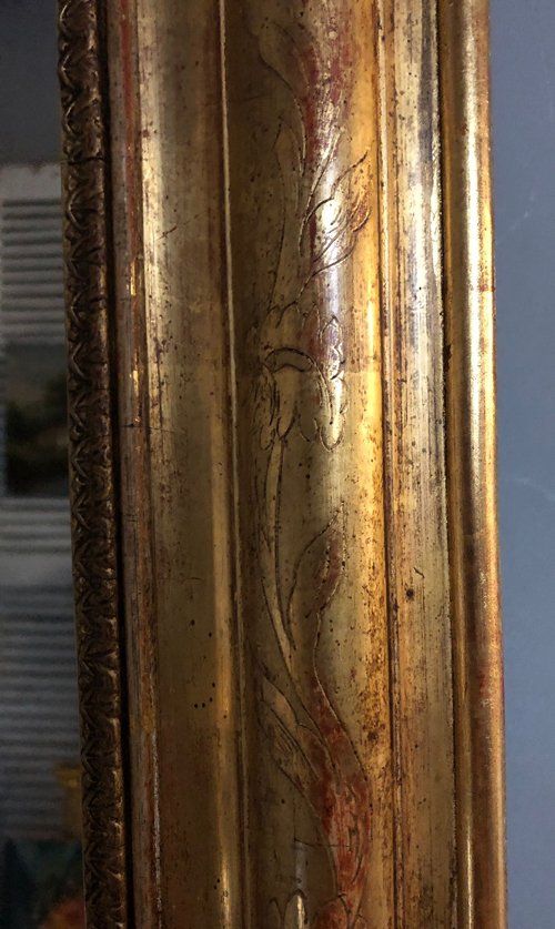 Ref 8047 - Antique French Mirror - Gilt on red Louis Philippe antique mirror with flower and leaf etching to frame. Finished in two tone gilt worn through to red bole and white gesso in places. New glass. Original pine board back. Circa 1880.