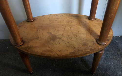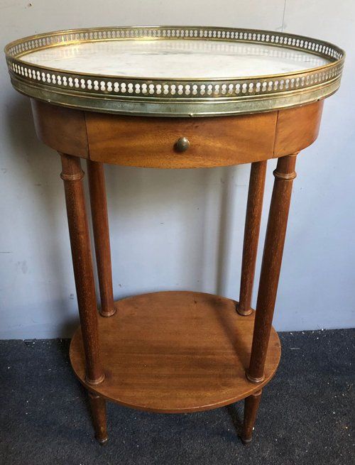 Ref 8050- Pair of French single drawer side tables with original brass galleries and marble tops. With overall fading and wear to original finish most noticeable on one lower shelf (see photos). Circa 1930.