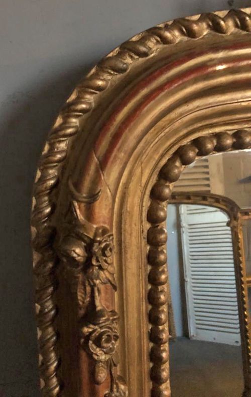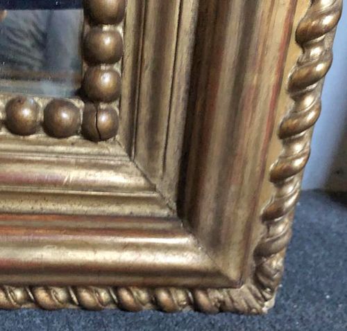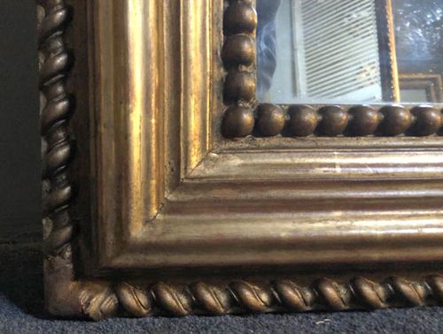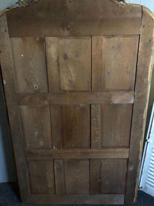 Ref 8052 - Antique French Mirror - Large gilt on red period antique mirror with gesso decoration to frame. Original mercury glass. Original panelled back. Circa 1820.