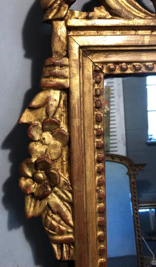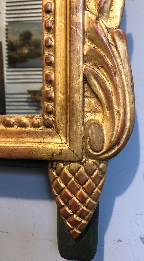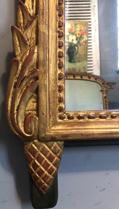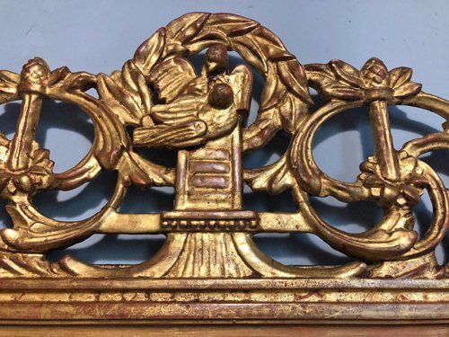Ref 8056 - Antique French Mirror - Carved giltwood Louis XVI style marriage mirror with love bird decoration to crest. Finished in original two tone gilt on red. Outer edge painted green. Original glass. Original pine board back. Circa 1930.