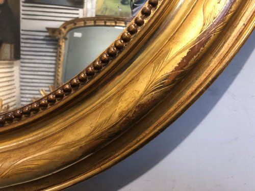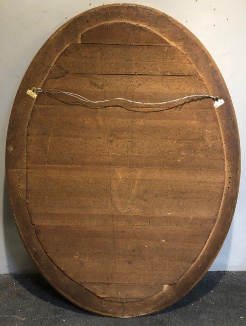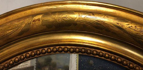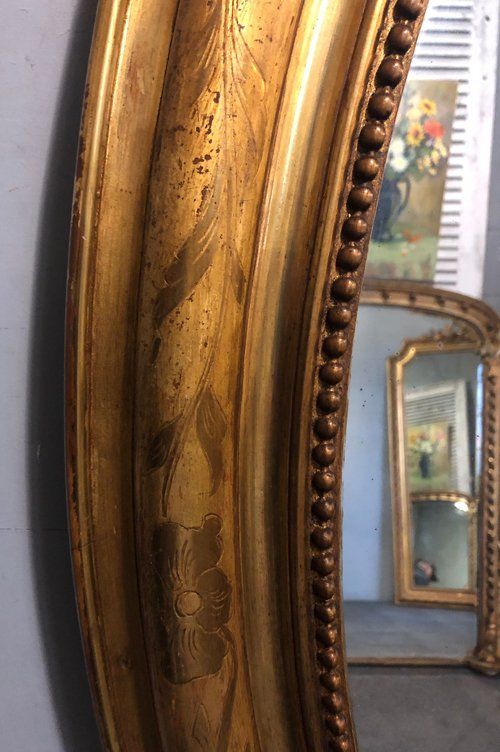 Ref 8058 - Antique French Mirror - Large gilt Louis Philippe period antique oval mirror with flower and leaf etching to frame. Landscape/portrait. Finished in mellow two tone gilt on red. Original mercury glass with some small patinated areas to outer edges. Original pine board back. Circa 1840.