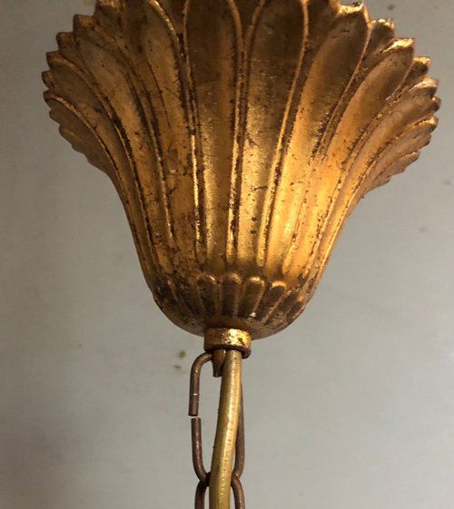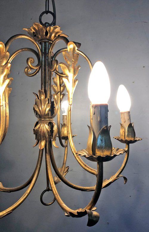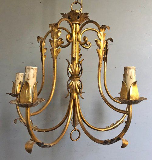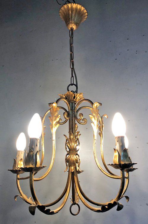 Ref 8063 - Gilt painted metal Italian 5 arm chandelier. Original ceiling rose and hanging chain. Working wiring and bulb fittings. Circa 1950.