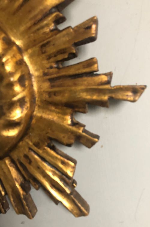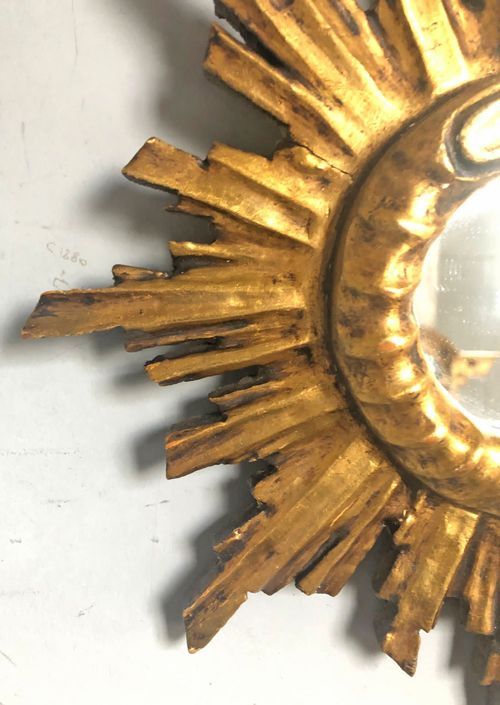 Ref 8067 - Carved giltwood sunburst mirror. Original glass. Circa 1950.