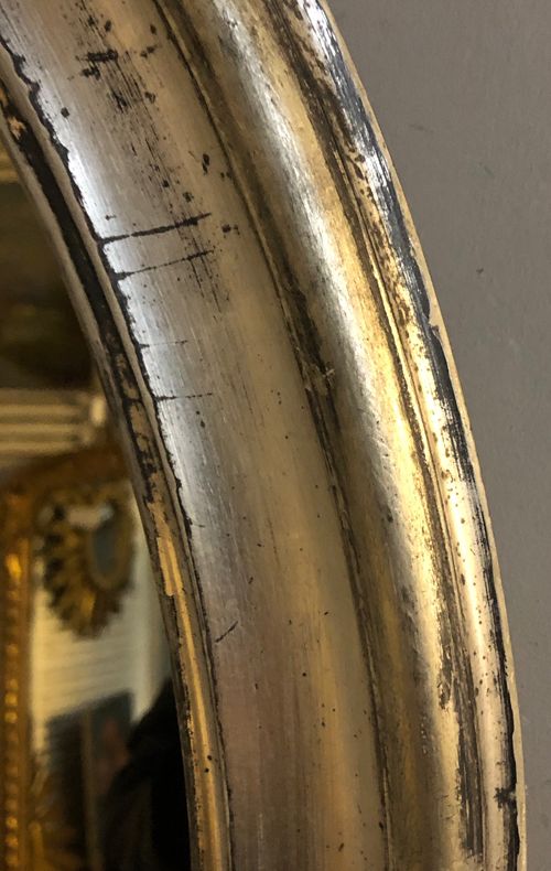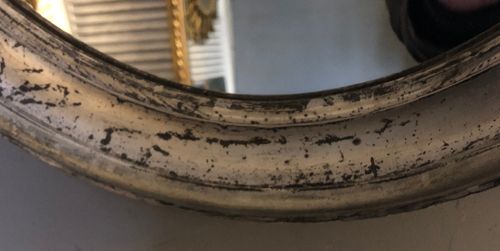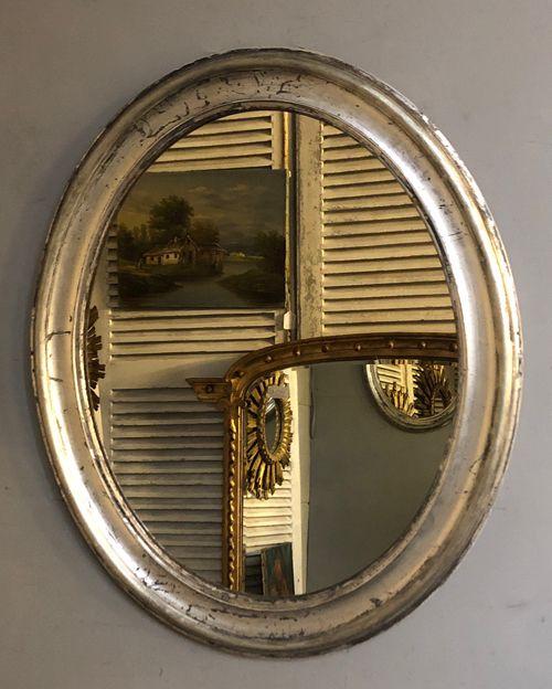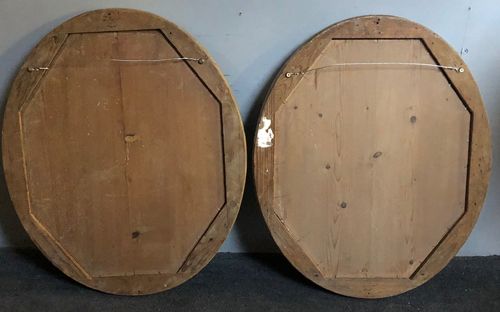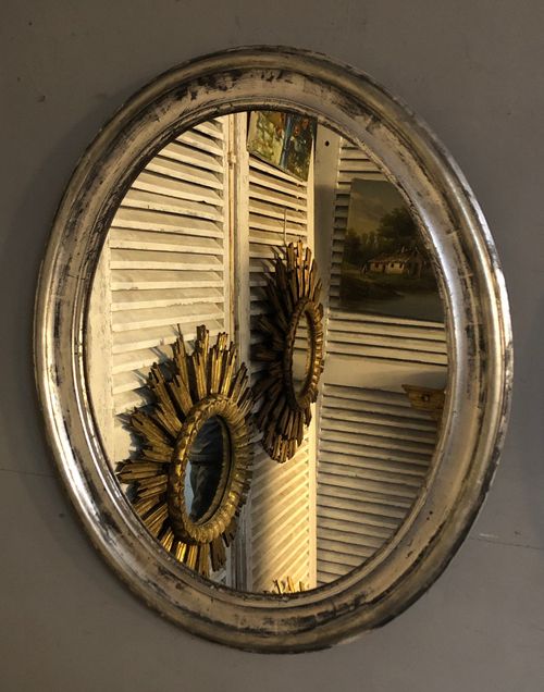 Ref 8080 - Pair of Antique French Mirrors - Pair of silver on black Louis Philippe oval antique mirrors. Landscape/ portrait. Original silver worn through to black bole and cream gesso in places. New glass. Original pine board backs. Circa 1900.