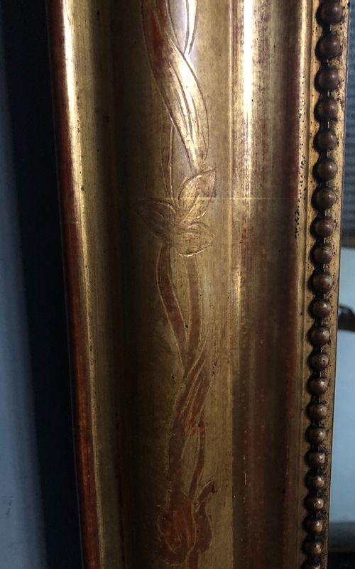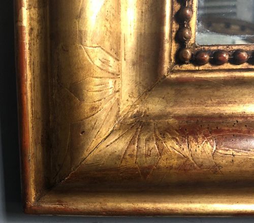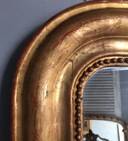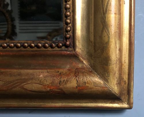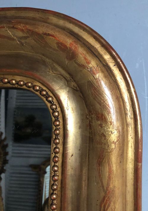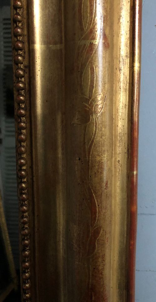 Ref 8082 - Antique French Mirror - Gilt on red Louis Philippe antique mirror with flower and leaf etching to frame. Original two tone gilt worn through to red bole in places. Some non-structural shrinkage cracks to top corners. Original glass. Original pine board back. Circa 1880.