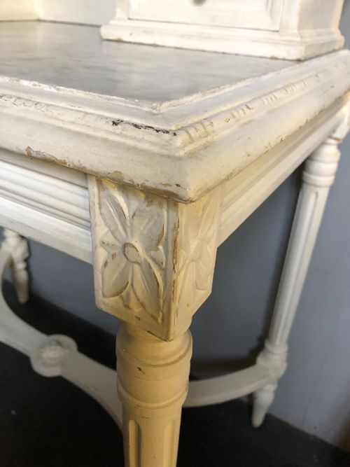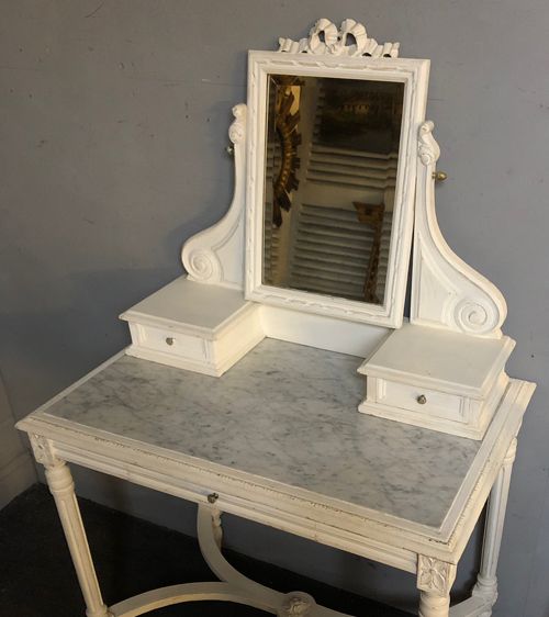 Ref 8087 - Worn white painted Louis XVI style antique French dressing table with ribbon crested mirror and original pale grey figured marble top. Three drawers. Original bevelled glass. Circa 1900.