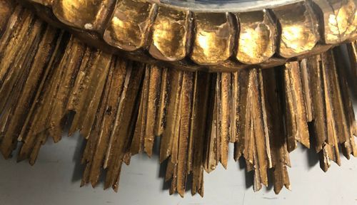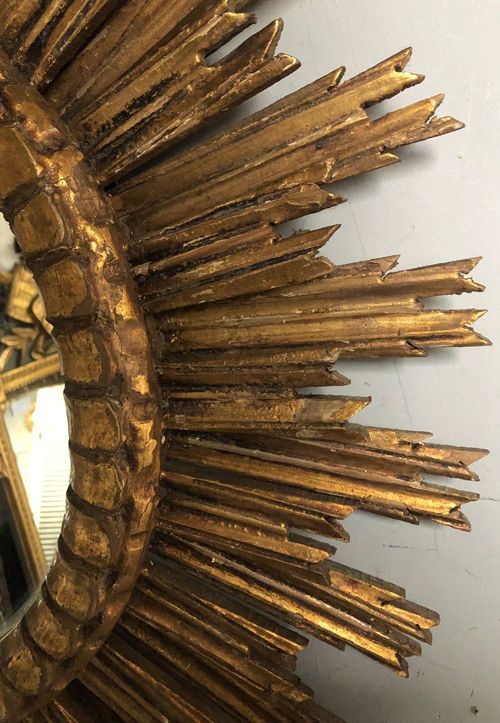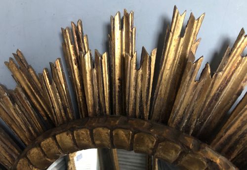 Ref 8089 - Large carved giltwood double ray sunburst mirror. Original glass. Circa 1950.